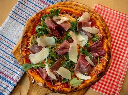 Prosciutto, Fresh tomato, mozzarella cheese, red sauce, wild rocket, radicchio, aged shaved Parmesan, balsamic glaze, and finished with extra virgin olive oil