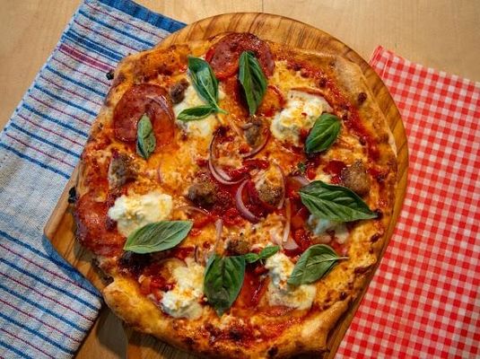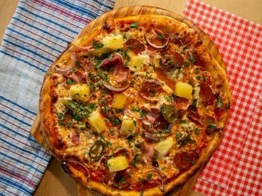 Double smoked leg ham, Chorizo sausage, prosciutto, roasted pineapple, Red sauce, mozzarella red onion, and pickled jalapeno