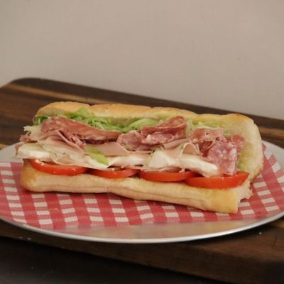 Hot Sopressa Salami, double smoked ham peperoni, provolone cheese, iceberg lettuce, tomato, onions, spiced peppers extra virgin oil, wild oregano and vinegar dressing served on 8 inch Sub