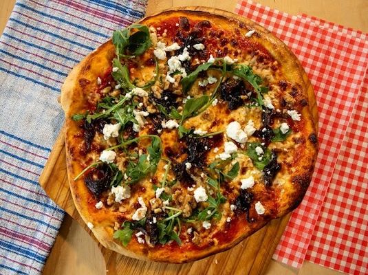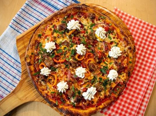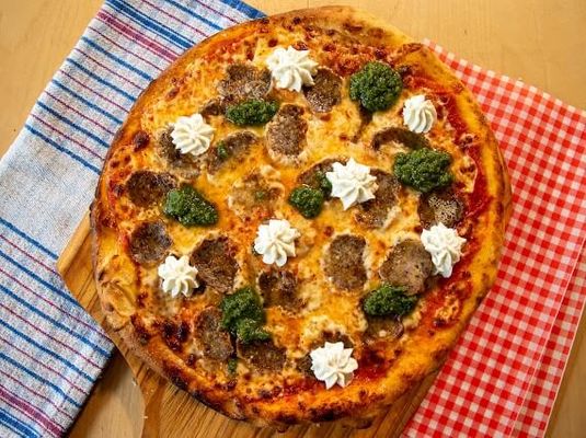 Spicy Italian style Pork and Fennel sausage, charred broccolini, Calabrian hot chilli, red sauce, ricotta cheese, Jon Jons hot honey drizzle