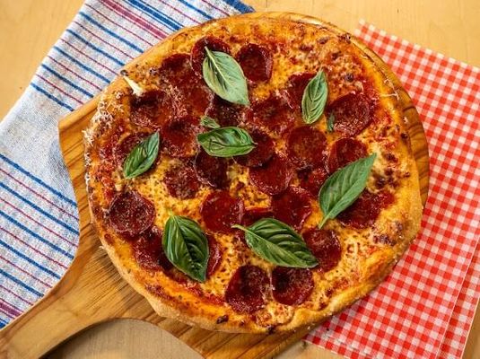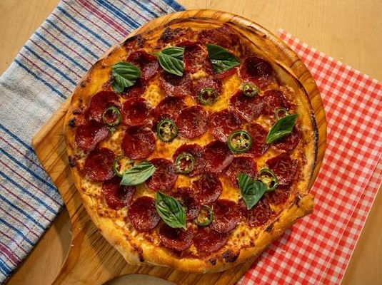 Spicy Pepperoni, red sauce, Mozzarella, Parmesan and fresh basil