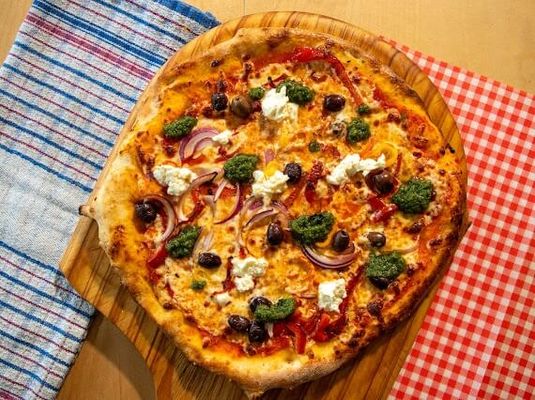 Grilled Eggplant, red onion, roasted red peppers, marinated Persian feta, black kalamata olives, pine nuts, and our house basil pesto
