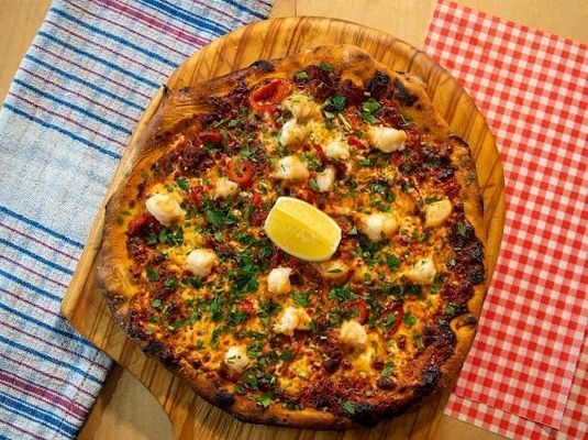 Garlic prawns, signature vodka tomato cream sauce, semi dried cherry tomato, mozzarella, spicy ndjua salami and parsley
