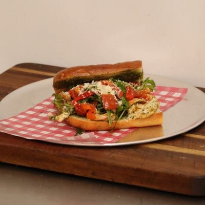 Grilled Eggplant, , roasted peppers , tomato, portebello mushrooms ,ricotta and pesto Schiacciata (Tuscan style bread)