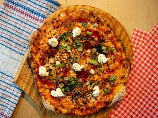Korean bbq chicken, gouchang chilii sauce, mozzarella, green shallots, toasted black sesame, Kimchi and Kewpie mayo